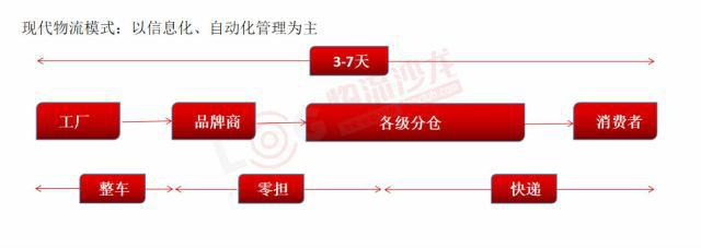 電子商務的發展沖擊了傳統零售,傳統賣場2B的市場逐步被2C的電商替代,傳統物流模式也隨之變化。物流活動逐漸以消費者為核心,各級分倉替代了原有的各級代理商及大量的門店,“新生”的快遞及倉儲環節也蠶食了原有的零擔部分,自動化及信息化逐步應用,整個鏈條的時效縮短至3-7天。